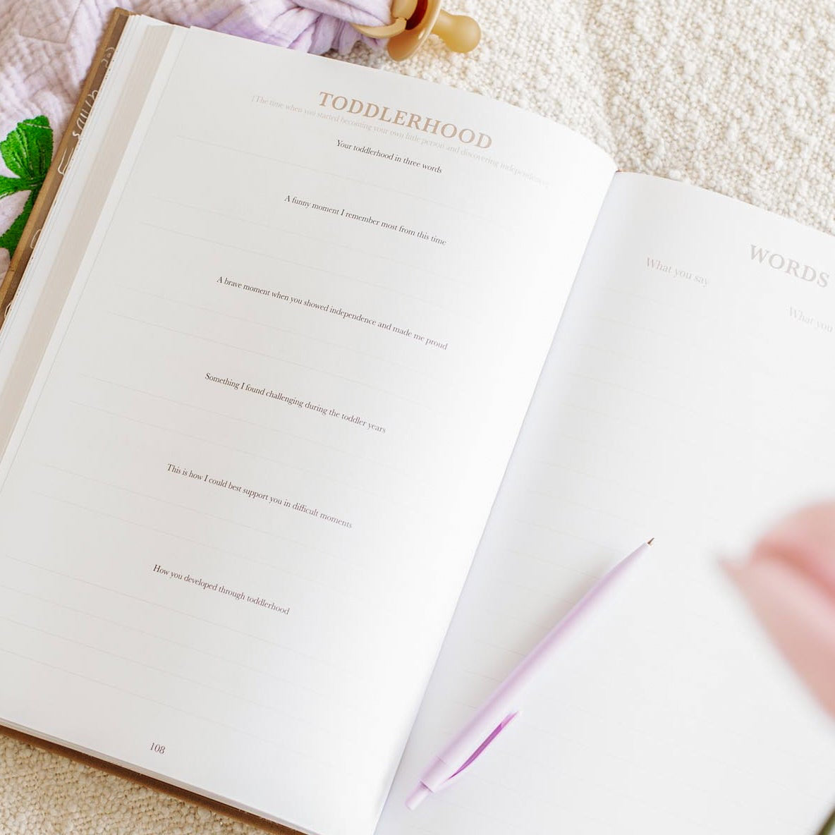 1 year old, 2 years old, 3 years old, 4 years old, First steps, Toddlerhood, Words you say, Quotes, Just Like me, Teething, Potty training, Growth chart, Your imagination, Funniest questions, A night away from home, Childcare