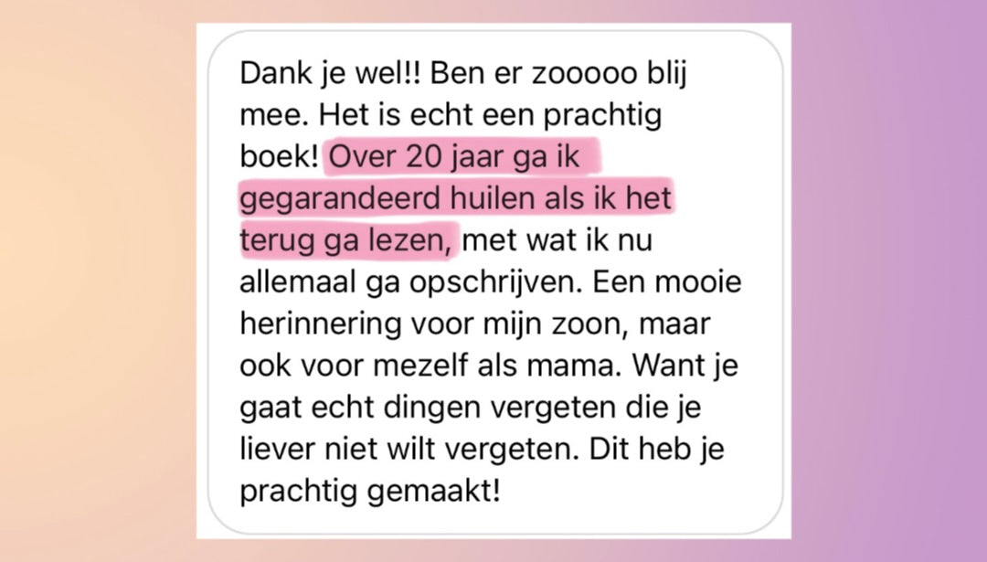 Het boek bestaat uit 320 pagina's waarin je deze periode vanuit de 'ik-vorm' vertellend vastlegt, zodat jouw kind dit tijdsdocument jaren later terug leest, alsof je het zelf zou voorlezen.